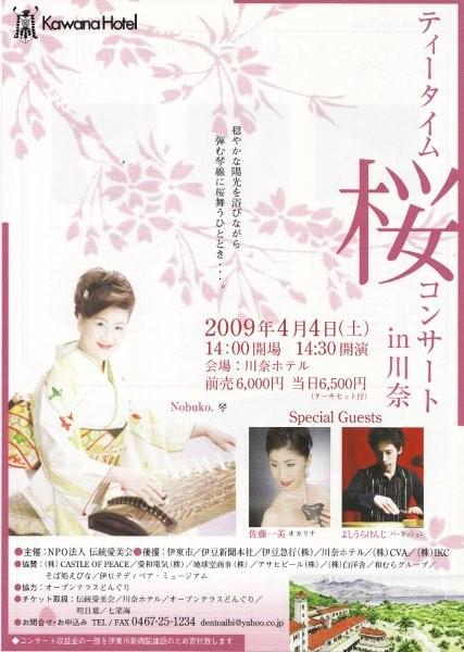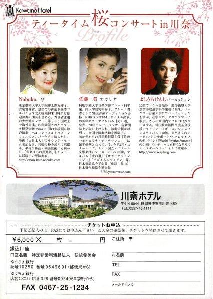 | ティータイム桜コンサート in 川奈 2009/4/4(土) 14:00開場 14:30開演 前売6000円 当日6500円(ケーキセット付) 川奈ホテル(伊東市川奈1459 0557-45-1111) 演奏:琴/Nobuko. Special Guests:オカリナ/佐藤一美 パーカッション/よしうらけんじ 主催:NPO法人伝統愛美会 後援:伊東市 伊豆新聞本社 伊豆急行梶@川奈ホテル 海VA 蟹KC 協賛 : 海ASTLE OF PEACE 愛和電気梶@地球堂商事 アサヒビール梶@株苧m舎 和むらグループ そば処えびな 伊豆テディベア・ミュージアム 千葉北住宅保全サービス 協力 : オープンテラスどんぐり 東海自動車株式会社 琴アカデミー チケット取扱:伝統愛美会 川奈ホテル オープンテラスどんぐり 明日葉 七菜海 お申込み・お問合せ:伝統愛美会事務局 dentoaibi@yahoo.co.jp TEL / FAX 0467-25-1234 コンサート収益の一部を伊東市新病院建設のため寄付します。